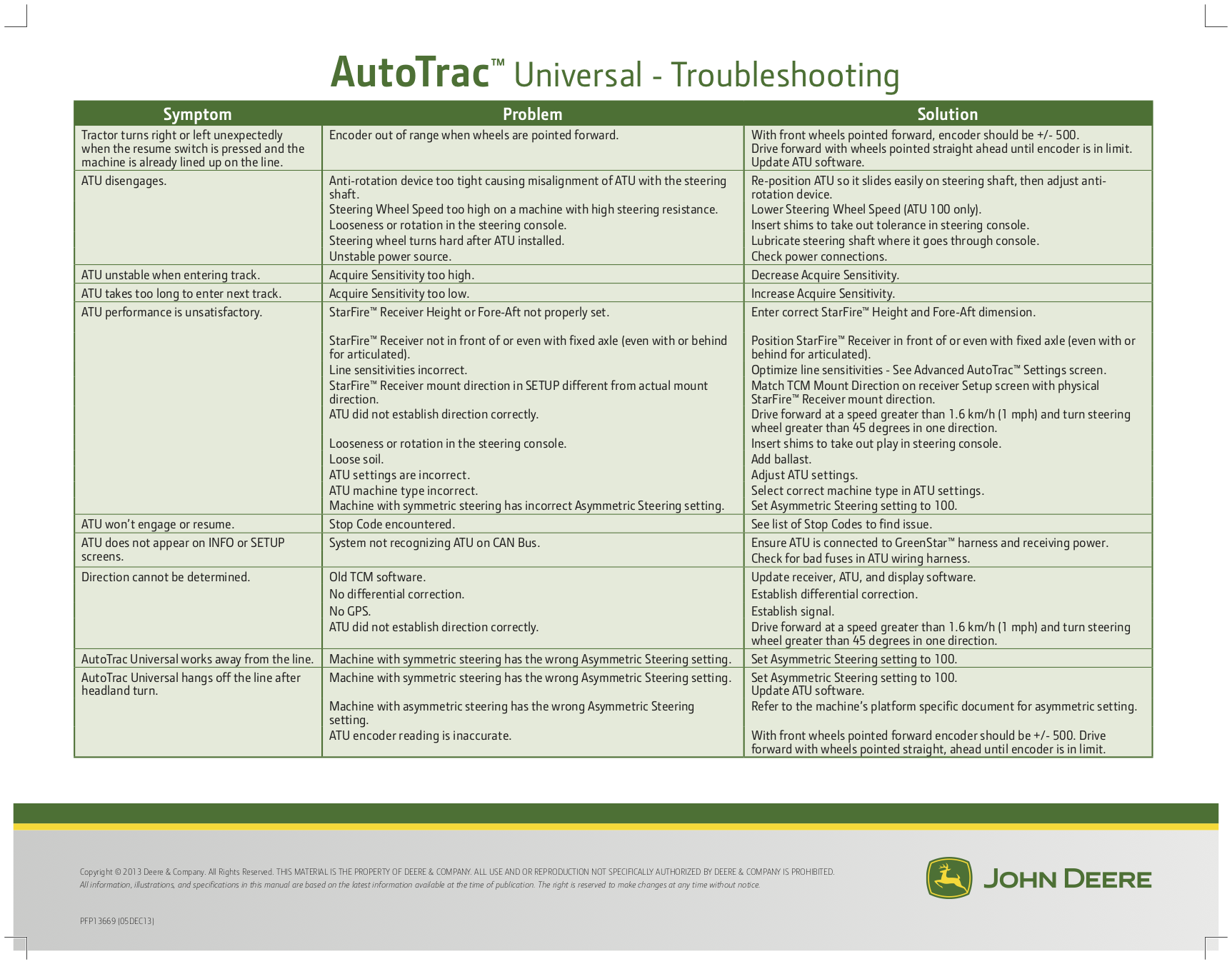 Excessive wear on steering components may impact accuracy. Make sure steering system components have proper tolerances. Steer Play setting may improve performance on some machines, but cannot compensate for all wear. After installing AutoTracTM Universal Steering Kit, check steering system every 500 hours for proper tolerance and wear. Operator needs to tighten nut on steering wheel to manufacturer’s specified torque.