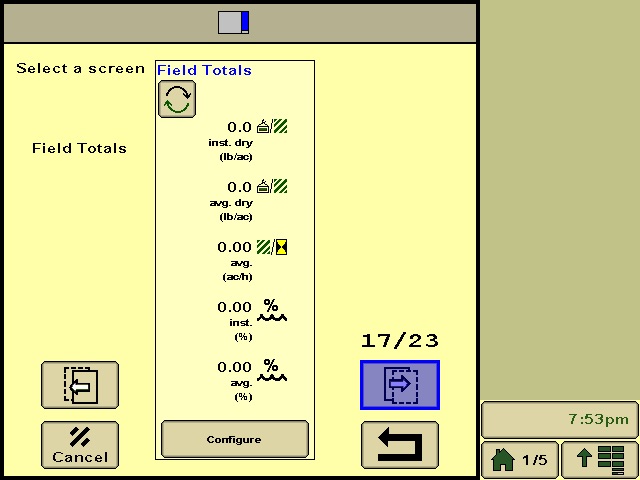 Now you need to setup the sidebar. Touch the sidebar spot on the screen. This maybe represented by a tall blue rectangle. You will need to choose GS3 as your information source again. You will use the page icon at the bottom to advance to page 17 of 24. This page will show you field totals data.